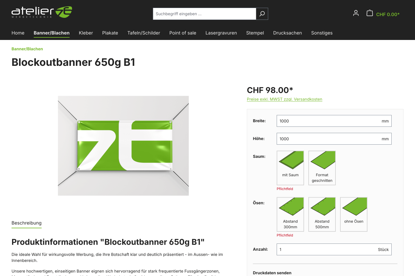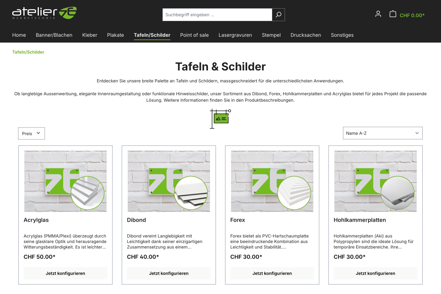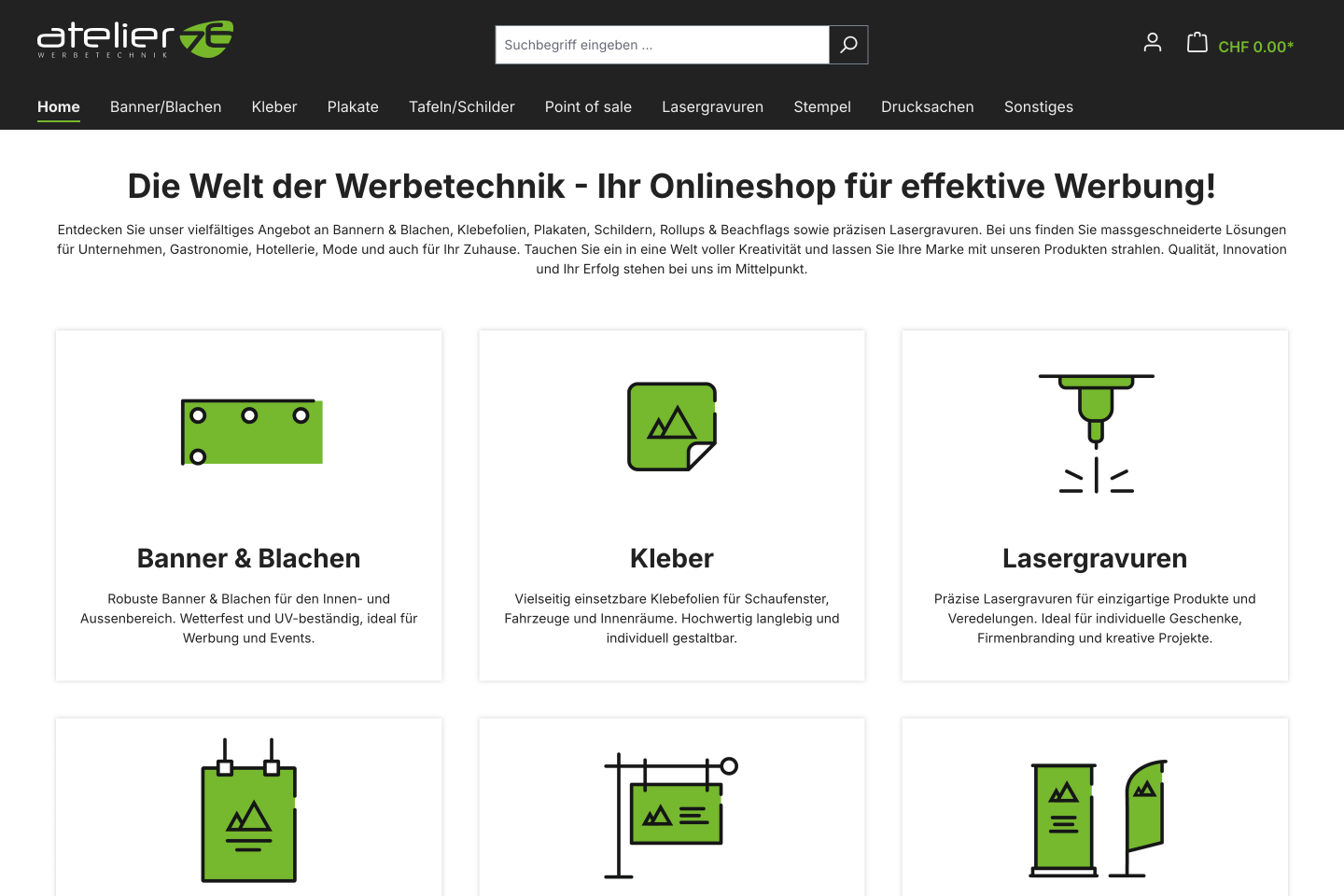 Webshop für Atelier 76 AG in Altendorf — Werbetechnik, Beschriftungen und Druck.